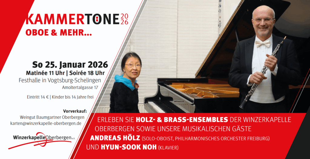 Am Sonntag, 25. Januar 2026 finden die diesjährigen Kammertöne im gewohnten Format einmal morgens um 11 Uhr und abends um 18 Uhr in der Festhalle in Schelingen statt.