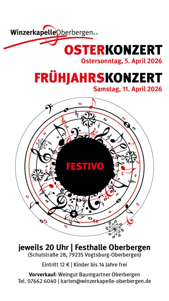 Ein ganz besonderes Highlight erwartet euch am Samstag, den 19. Juli 2025 beim Jubiläumskonzert zum 50-jährigen Stadtjubiläum der Stadt Vogtsburg. Mit allen Vogtsburger Musikvereinen und der Jugendkapelle Oberbergen-Oberrotweil haben wir ein tolles und abwechslungsreiches Open-Air Konzert inklusive der Uraufführung "Vogtsburg 1975" zusammengestellt.